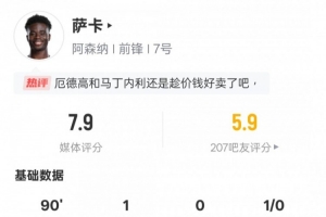 体育资讯5月8日讯 欧冠半决赛次回合,阿森纳客场1-2巴黎圣日耳曼。萨卡首发出战,打进1粒进球,送出2次关键传球,但也错失1次进球机会,评分7.9。